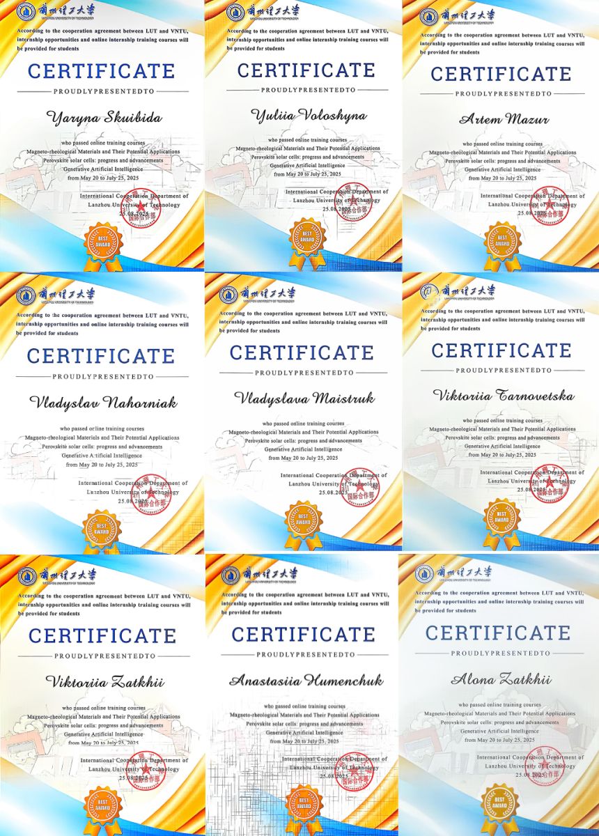 У період з травня по липень 2025 року здобувачі різних курсів освітньо-професійної програми Енергоефективні системи створення мікроклімату будівель взяли участь у міжнародному стажуванні в Ланьчжоуському технологічному університеті (КНР). Онлайн-тренінг проводили провідні лектори за трьома напрямками: "Магнітно-реологічні матеріали та їх потенційне застосування", "Перовскітні сонячні елементи: прогрес та досягнення", "Генеративний штучний інтелект". Загальна тривалість курсу становила 180 годин (6 кердитів).