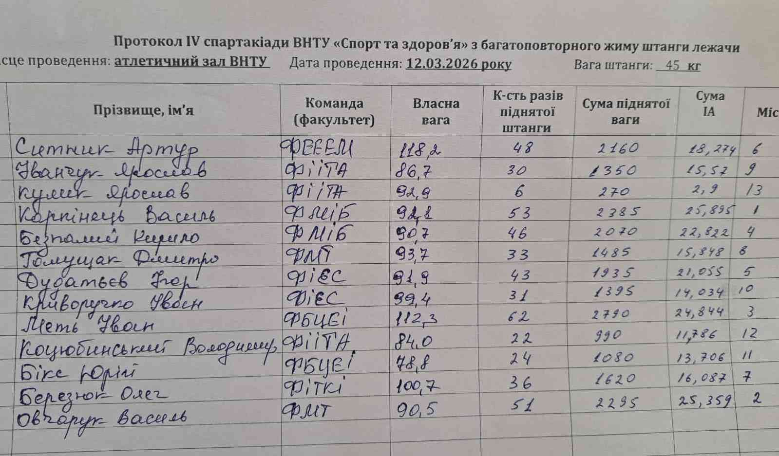 1 місце – Василь КАРПІНЕЦЬ (ФМІБ), 53 підняття штанги, ІА=25,895;