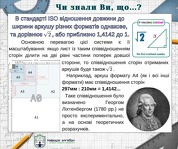 В міжнародному стандарті розмірів аркушів, ISO 216, відношення ширини до довжини аркушу різних форматів однакове, та дорівнює квадратному кореню з двох, або приблизно 1 до 1,4142. докладно...