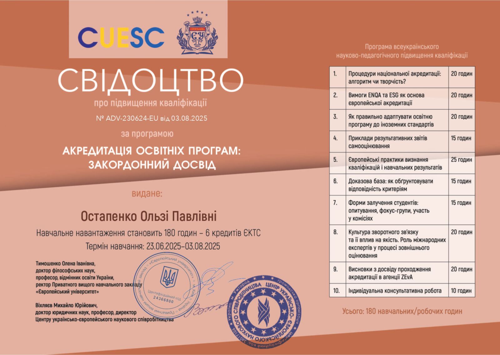 Протягом 23 червня – 3 серпня 2025 року пройшла Всеукраїнське науково-педагогічне підвищення кваліфікації "Акредитація освітніх програм: закордонний досвід" обсягом 180 годин (6 кредитів) від ЦУЄНС та Європейського університету.