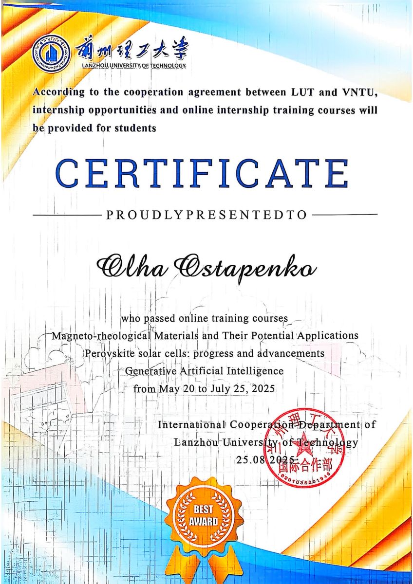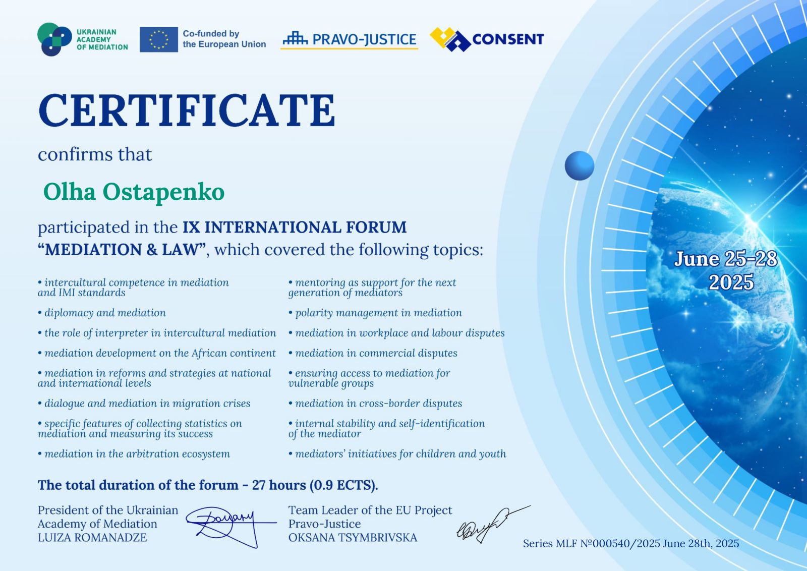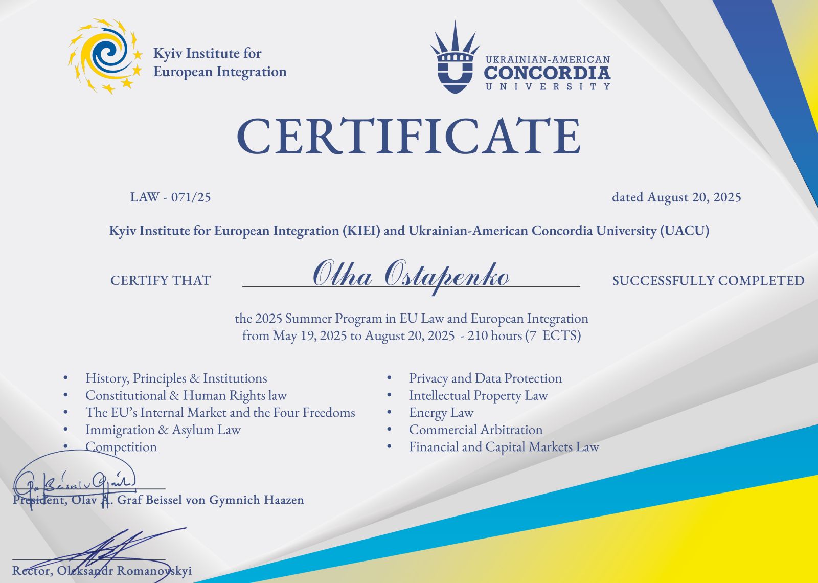 Протягом 19 травня - 20 серпня 2025 року пройшла міжнародне стажування обсягом 210 годин (7 кредитів) в рамках Міжнародної онлайн-літньої школи з європейського права та європейської інтеграції, організованої Київським інститутом європейської інтеграції (Нідерланди) у співпраці з Українсько-американським університетом Конкордія (Україна). За результатами міжнародного стажування отримано сертифікат.