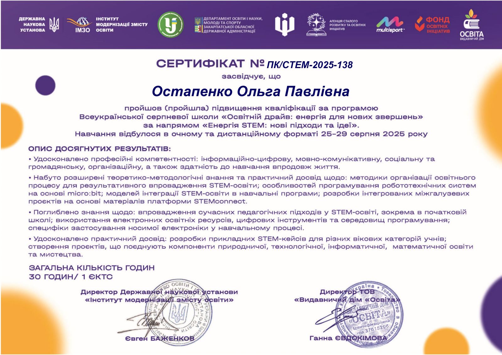 Протягом 3 березня – 13 квітня 2025 року пройшла Всеукраїнське науково-педагогічне підвищення кваліфікації "Управління якістю освіти закладу вищої освіти" обсягом 180 годин (6 кредитів) від ЦУЄНС та Центральноукраїнського державного університету імені Володимира Винниченка.
