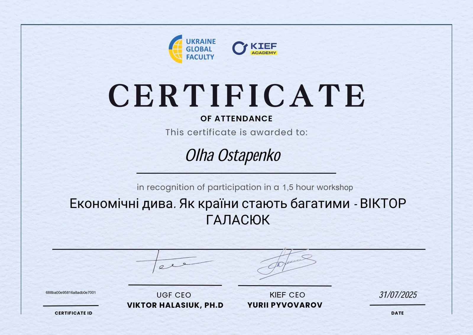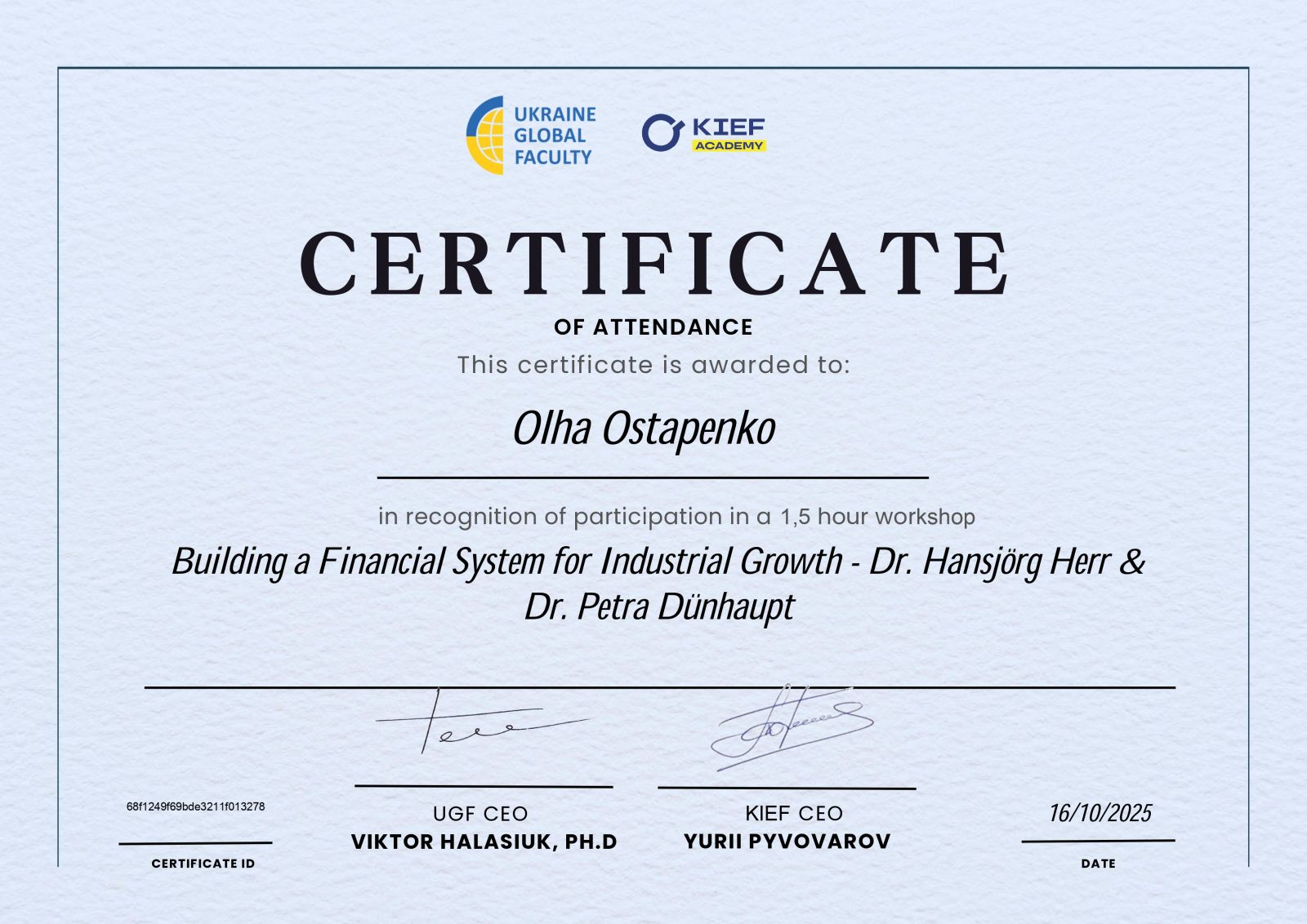 Протягом березня-липня 2025 року брала участь у проєкті «Економічне навчання для підприємств, постраждалих від війни в Україні», що проводився за підтримки Міністерства закордонних справ Нідерландів у рамках програми зовнішньої політики розвитку Нідерландів, що фінансується програмою розвитку приватного сектору Агентства з питань підприємництва Нідерландів (RVO.nl). Проєкт реалізовано Академією КМІФ (ГО «Київський міжнародний економічний форум») на платформі Ukraine Global Faculty під егідою Міністерства економіки України та спрямований на зміцнення стійкості, відновлення та розвитку малих та середніх підприємств в Україні. Провідні світові та українські експерти провели 36 лекцій та семінарів, що охоплюють економіку, системне мислення, стратегію, штучний інтелект, фандрейзинг, кризове управління, бережливе виробництво, PR тощо. За результатами навчання отримано сертифікат.