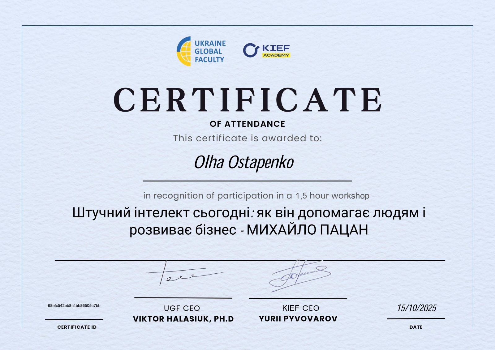 Сертифікат про підвищення кваліфікації від Національного Агентства Кваліфікацій