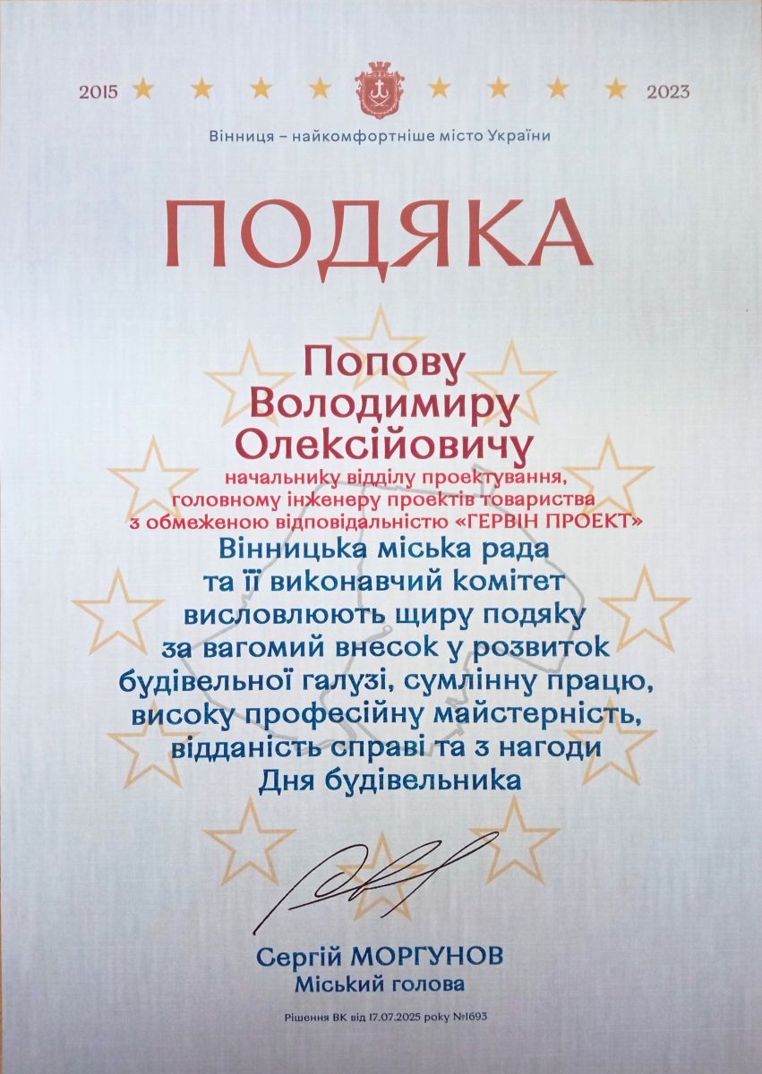 У 2025 році рішенням ВК №1693 отримав Подяку Вінницького Міського Голови Сергія Моргунова за вагомий внесок у розвиток будівельної галузі.