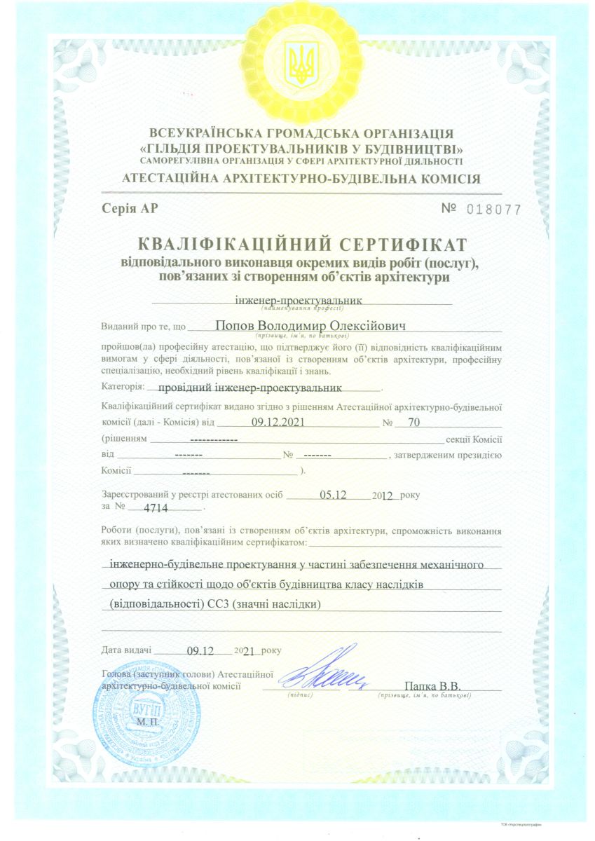 2.6. Проект підсилення конструкцій будівлі Свято-Петропавлівської церкви по вул. Тургєнєва в м. Буча Києво-Святошинського району, Київської області. Головний архітектор проекту – Косарєв В. І. Головний конструктор – Попов В.О. (2011). Проект реалізовано.