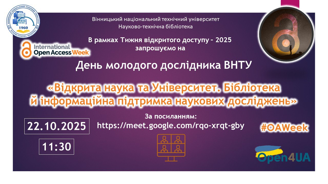 Запрошуємо аспірантів І року навчання (та усіх бажаючих) на «Молодий дослідник ВНТУ: День інформації» в межах Міжнародного тижня Відкритого доступу.