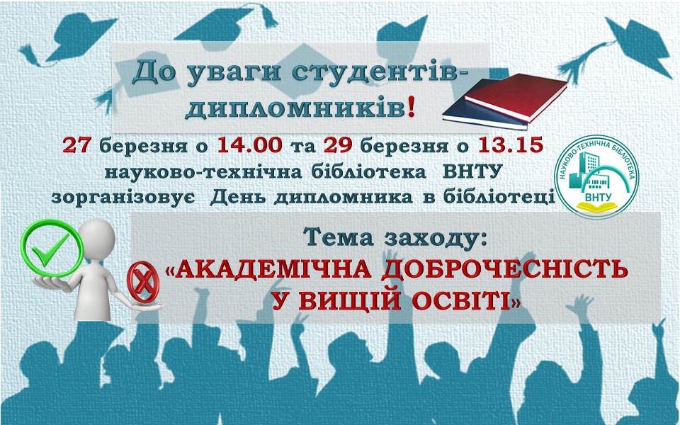 27 березня о 14.00 та 29 березня о 13.15 в приміщенні книгозбірні (кімн. 304) буде проведено День дипломника в бібліотеці.