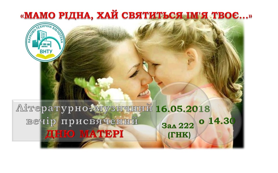 Науково-технічна бібліотека запрошує 16.05.2018 р. о 14.30, (зал 222 (ГНК)), на літературно-музичний вечір присвячений ДНЮ МАТЕРІ «МАМО РІДНА, ХАЙ СВЯТИТЬСЯ ІМ`Я ТВОЄ...».