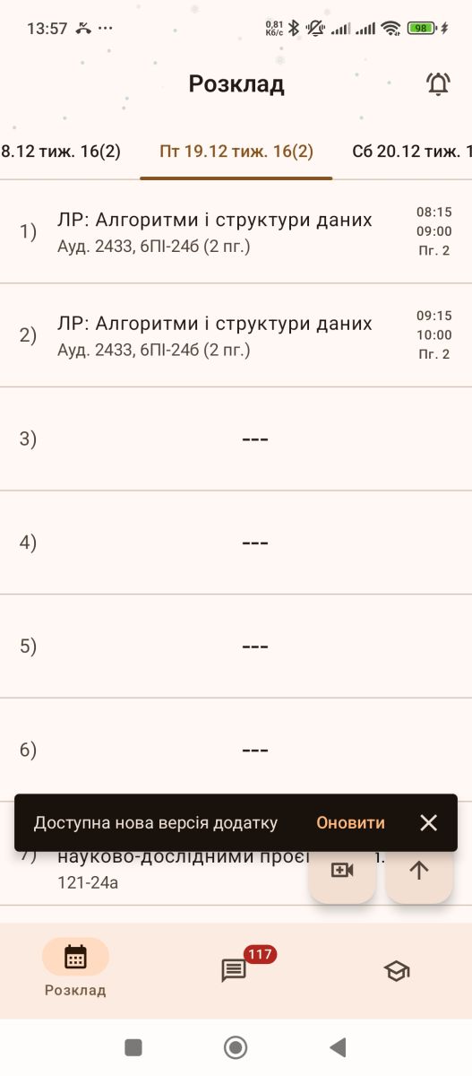 Оновлено мобільний застосунок JetIQTeacher для операційної системи AndroidСтворено оновлений мобільний застосунок JetIQTeacher для роботи викладачів. Змінено дизайн розкладу, додано функції пошуку користувачів, інформації про відпустку, розклад дзвінків, месенджер. Оновлюйте та працюйте із задоволенням. Дякуємо студенту 1АКІТ-22б Данилу Перепелюку. Працюємо разом!Авторські права © 2025 JetIQ - Усі права захищені.