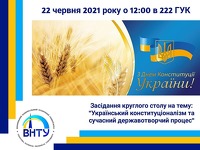 На честь 25-річчя прийняття Конституції України 22 червня 2021 р., о 12.00 , в аудиторії 222 ГУК та дистанційно (за посиланням: https://meet.google.com/iwn-ngbd-gfu ) відбудеться засідання круглого столу на тему: "Український конституціоналізм та сучасний державотворчий процес".