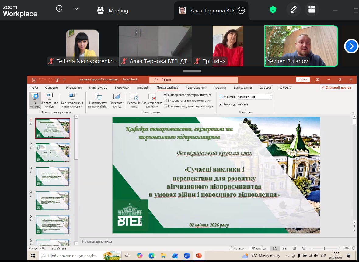 02 квітня 2026 року кафедрою товарознавства, експертизи та торговельного підприємництва у змішаному форматі було проведено Всеукраїнський круглий стіл на тему «Сучасні виклики і перспективи для розвитку вітчизняного підприємництва в умовах війни і повоєнного відновлення».